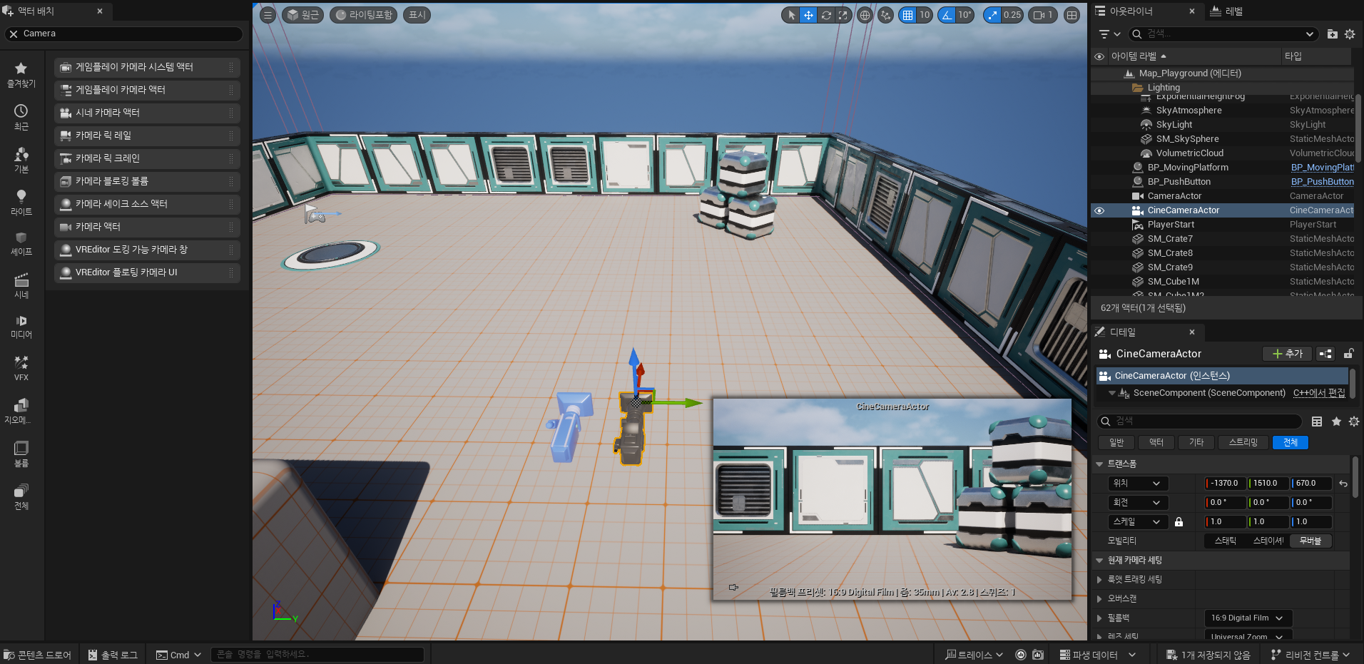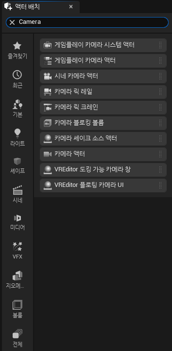 게임 내에서 시점을 결정하는 액터입니다. Pawn 또는 Character에 카메라를 붙일 수도 있지만, 별도의 독립된 카메라 액터를 배치해 원하는 시점 연출도 가능합니다.