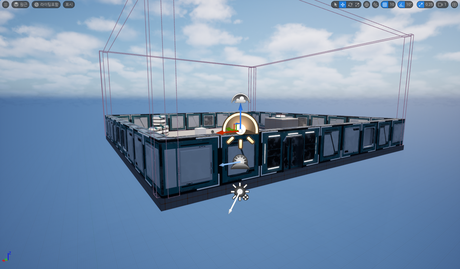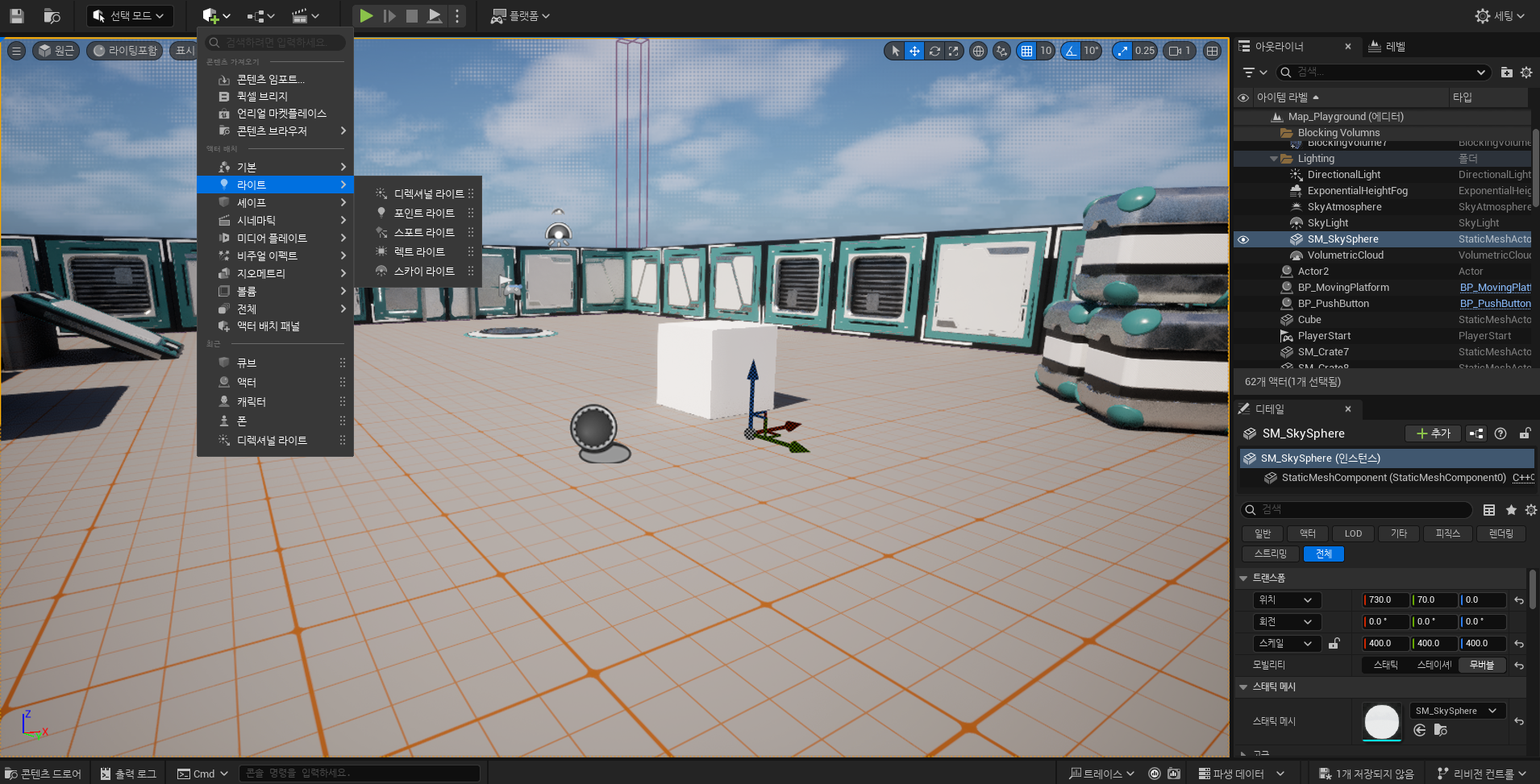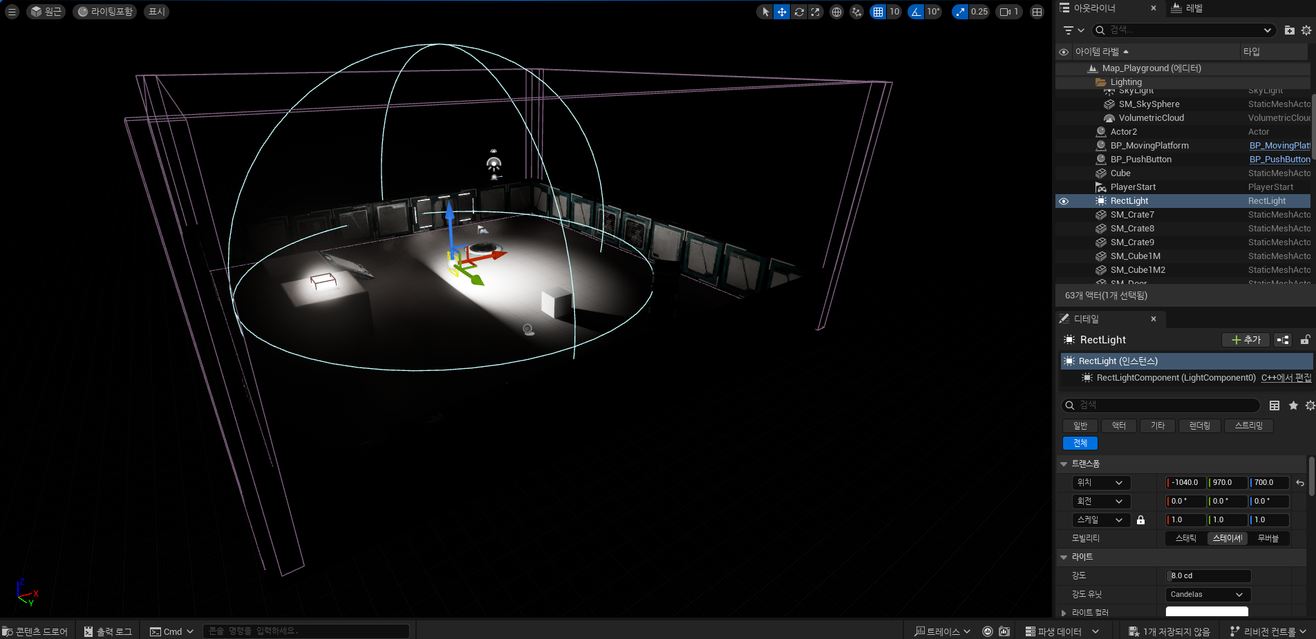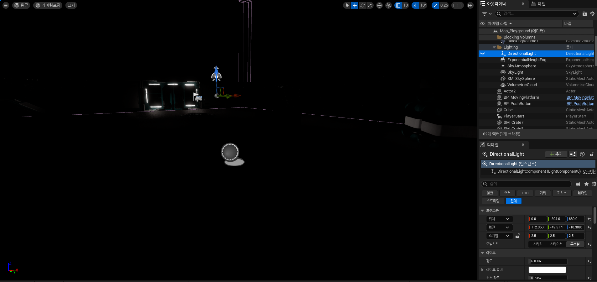 위 두가지 라이트 액터를 활용해서 외부에서 가져오는 빛의 효과를 만들 수 있습니다. 레벨 전체와 관련된 광원 효과이기 때문에 직접 조작 해보는 것을 추천드립니다.