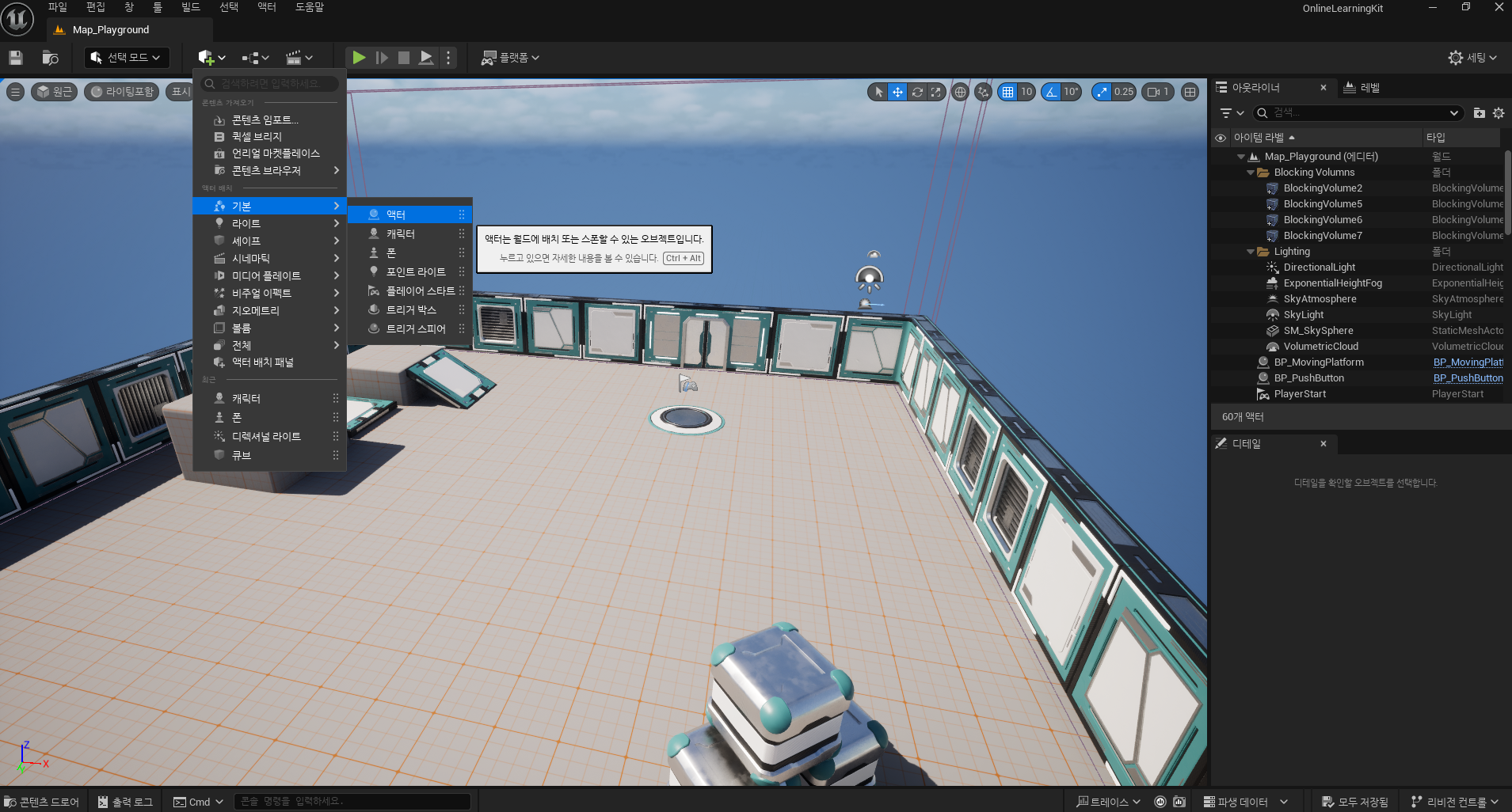 위에서 했던 방식대로 패널에서 액터 패널에서 드래그를 통해 배치하는 방법이 있고