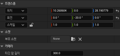 또한 타깃 암 길이를 늘려주면 SpringArm을 길게 뺄 수도 있습니다 350까지 늘리겠습니다. (위치 값, 회전 값은 임의로 맞춘것입니다)