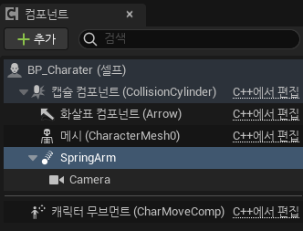 추가 > SpringArm 컴포넌트 > 생성된 SpringArm 컴포넌트 클릭 > 추가 > Camera 컴포넌트