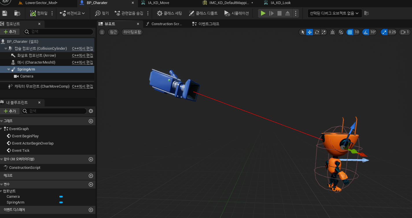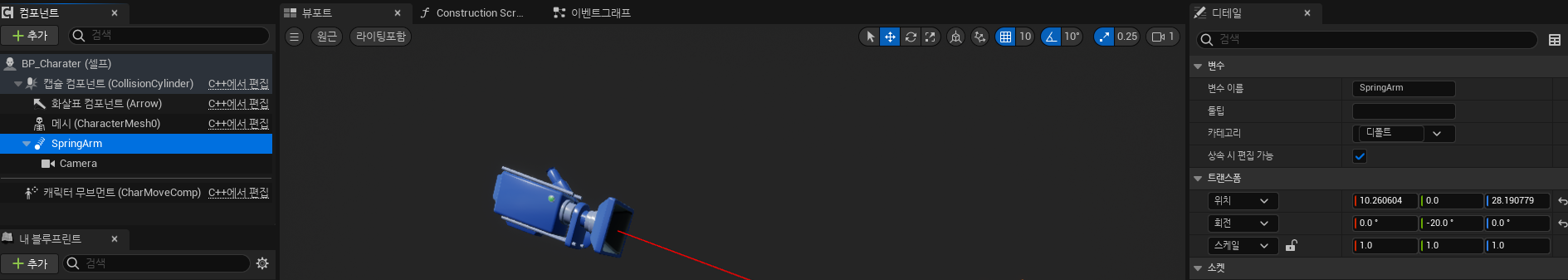 SpringArm 컴포넌트가 무슨 역할인지 확인해보겠습니다.