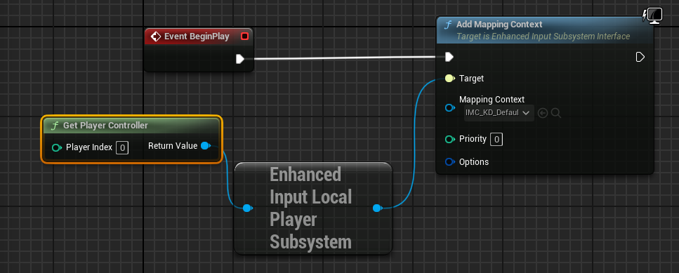Get Player Controller은 아까 poccess에서 설정한 0번이고 Enhanced Input Local Player Subsystem 향상된 인풋 시스템입니다. 그리고 add mappingcontext를 가져와서 mapping context 를 아까 만들어둔 IMC_KD_DefaultMappingContext로 만들고 실행하면,