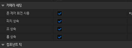 SpringArm > 디테일 패널 > 카메라 세팅 > 폰 제어 회전 사용 체크 합니다.