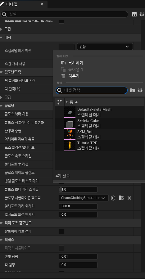 디테일 패널에 스켈레탈 메시에서 SKM_Bot 선택합니다.