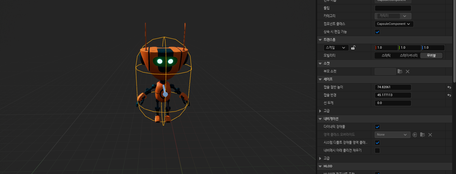캡슐 컴포넌트를 클릭하시고 디테일 패널에 세이프 값을 변경해서 바꿔주시면 됩니다.