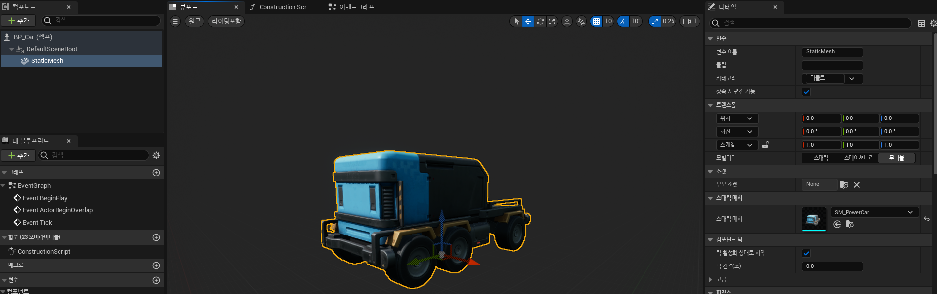 스태틱 메쉬 컴포넌트 추가하고, car 검색해서 넣어줍니다.