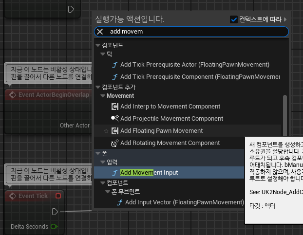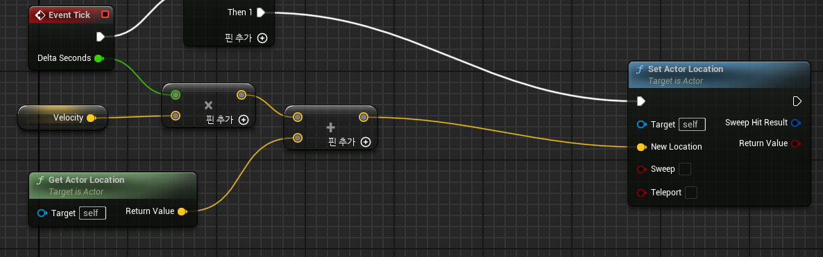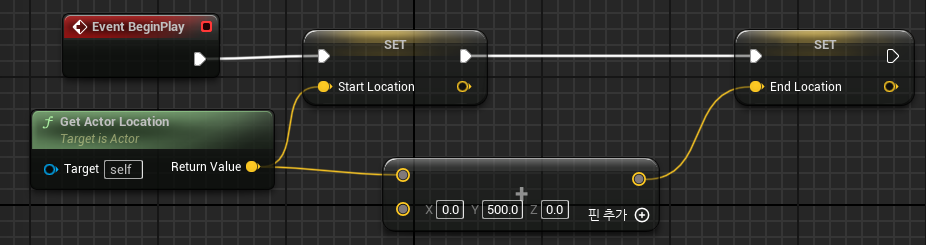 액터의 현제 위치와 더해주고, Set Actor Location으로 점점 이동시켜주는 로직입니다.