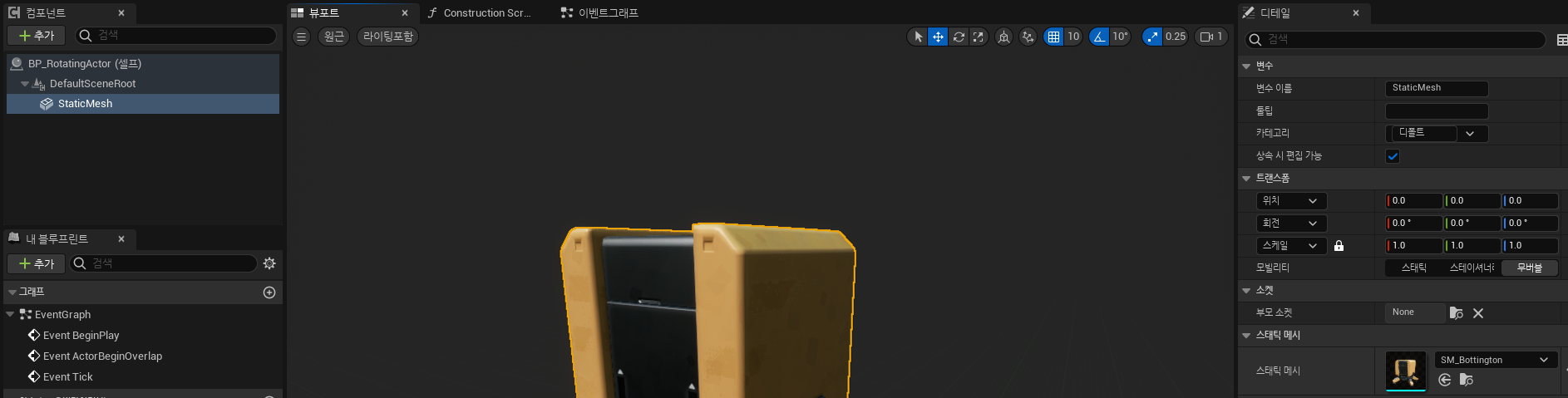스태틱 메쉬 컴포넌트 추가하고 SM_Bottinton 추가합니다.