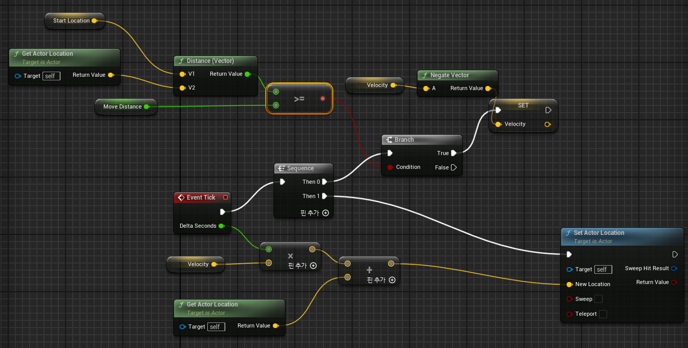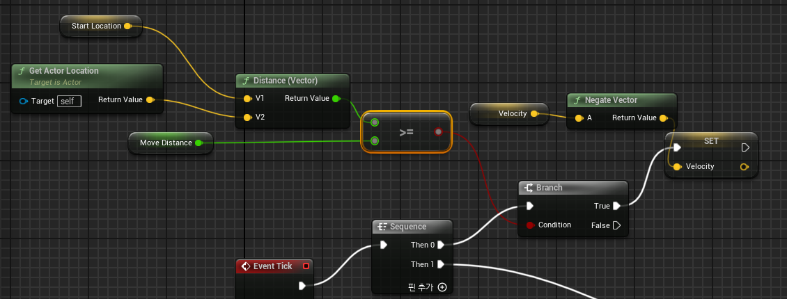 Distance(Vector)은 Start Location값과 현제 액터의 위치를 받아와서 이동 거리를 측정하고, 그걸 최대 이동거리와 비교하고 있는 로직입니다.