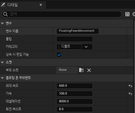 - 단순 부유 이동, 복잡한 물리 중력 계산 없이 AddMovementInput 등을 통해 이동합니다.