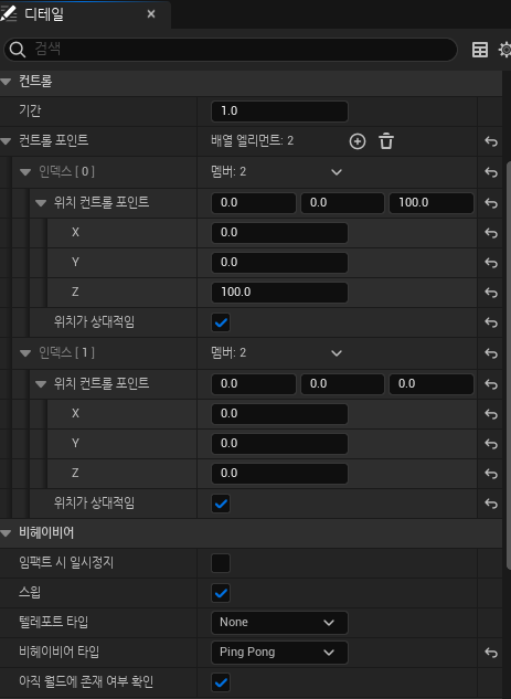 z축 100, 안건드리고, 비헤이비어에서 비헤이비어 타입 Ping Pong으로 설정합니다.